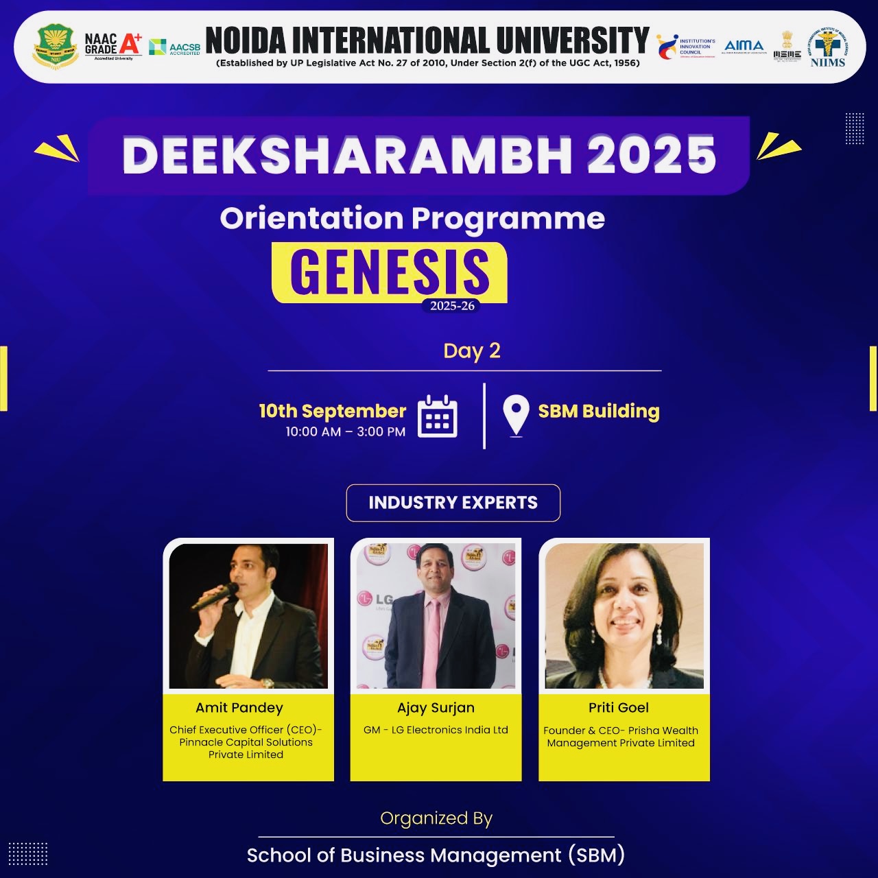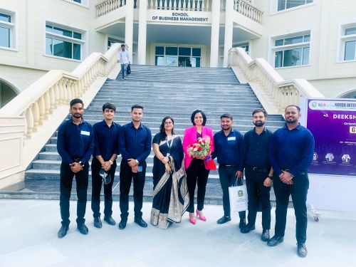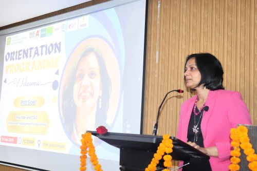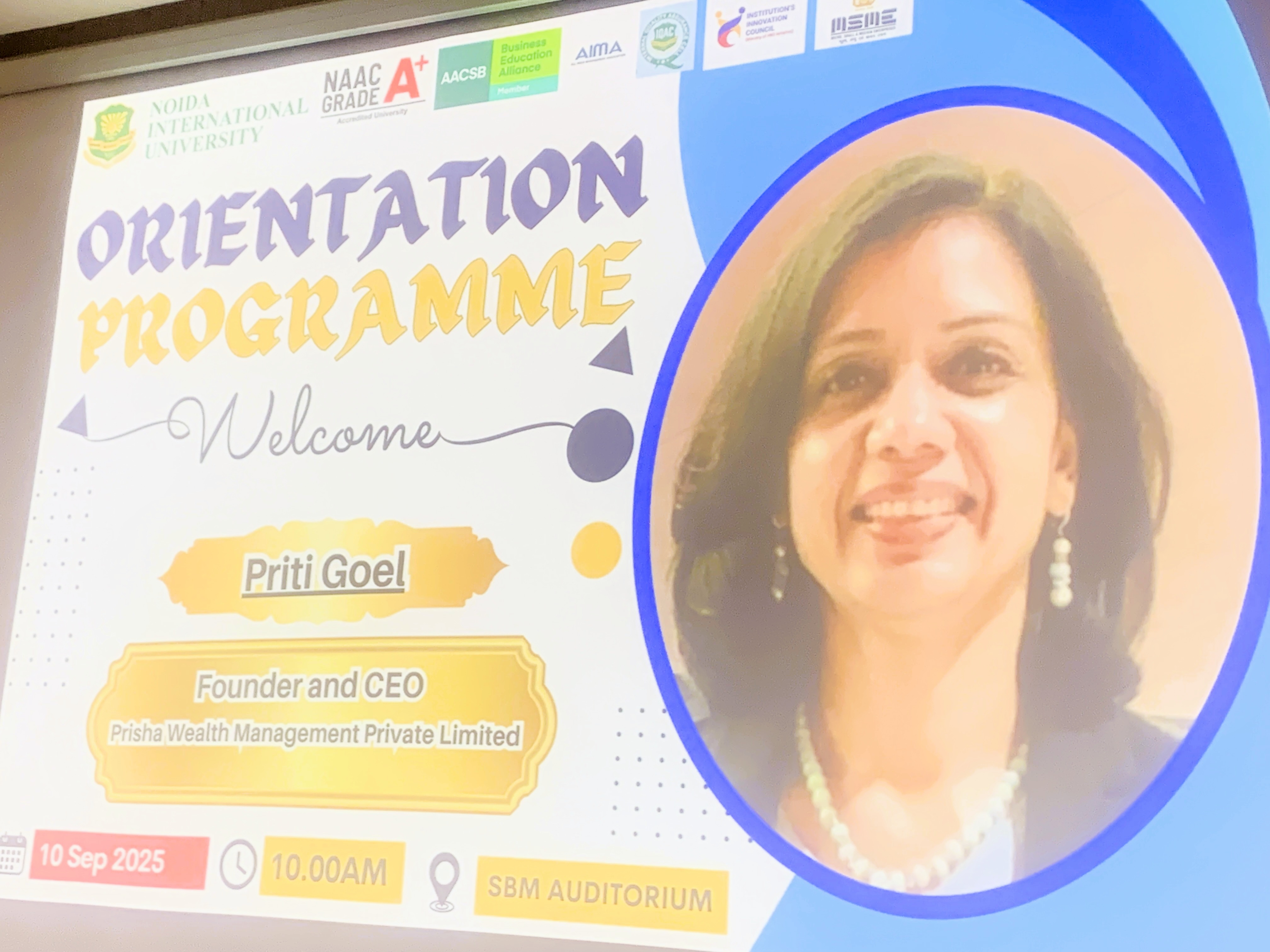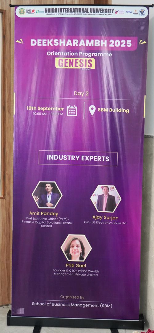Deeksharamabh 2025, Orientation Programme, Genesis 2025-26, Noida International University had invited Ms Priti Goel, our Managing Director for addressing the students and faculty of School of Business Management (SBM).